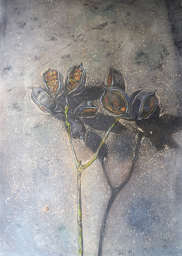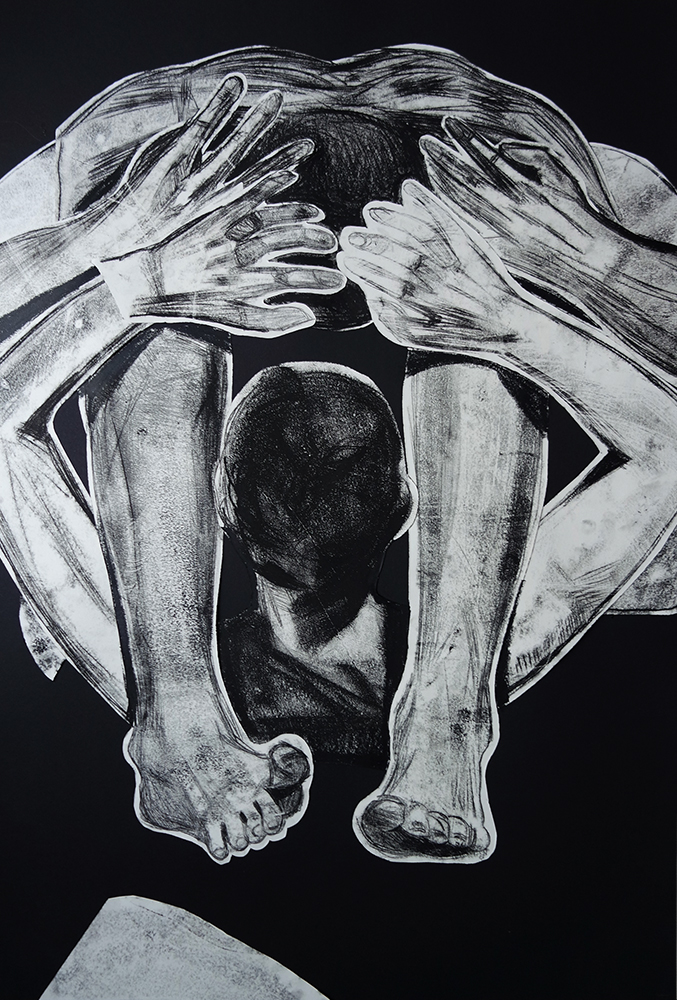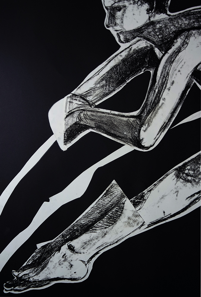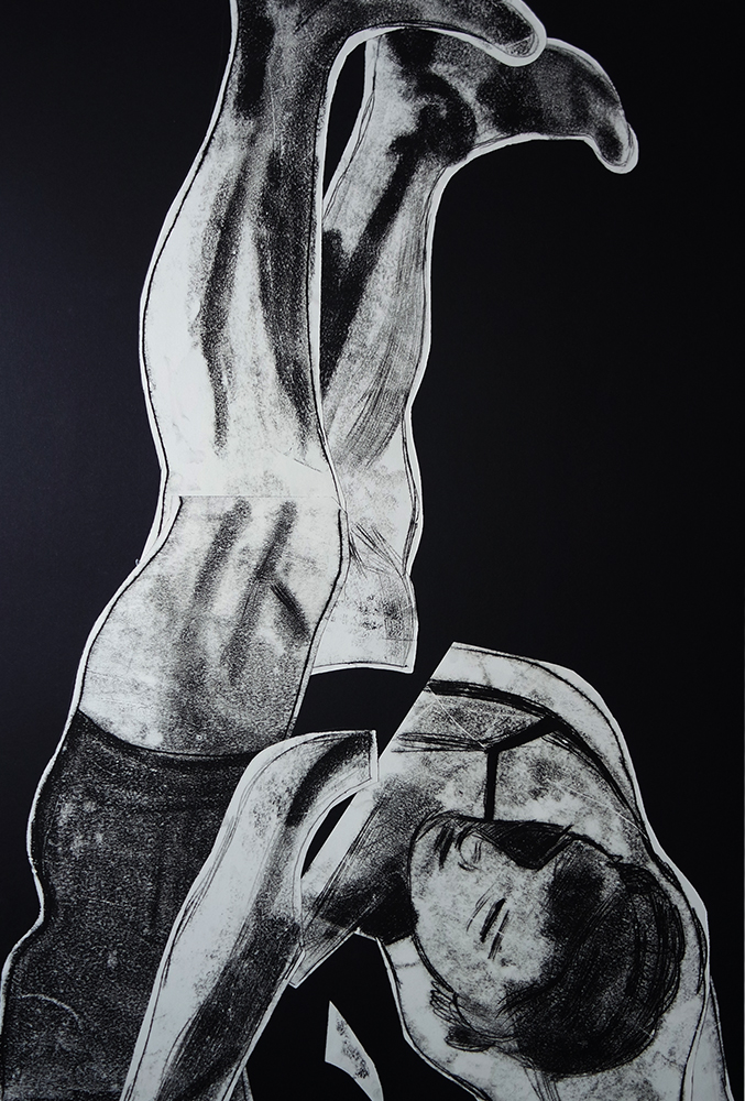 Die Umsetzung des Stückes in Form von grafischen Arbeiten empfand ich als besonders geeignet, da es auf mich farblich, von den Bewegungssequenzen und dem Licht einen entsprechenden Eindruck machte. Die zwölf einzelnen Bilder ( 90×70 cm) sind in einem gemischten Verfahren aus Öl, Druck und Collage hergestellt worden „.