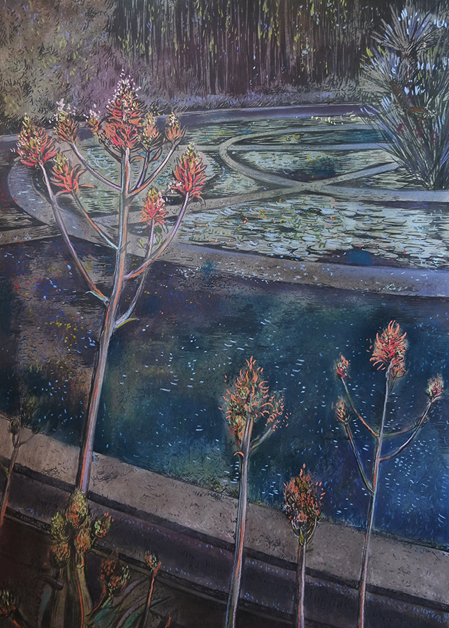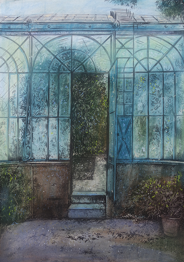 Die Idee des Palermo Projekts ist mir in Palermo selbst gekommen. Ich hatte zu diesem Zeitpunkt bereits auf Sardinien eine neue Technik erfunden, in dem ich die mit Markern gearbeiteten Zeichnungen mit Pastell bearbeite, um sie dann mit Lack zu vervollständigen. Durch diese Technik ist es mir möglich, die besondere Atmosphäre der Orte eindringlich wiederzugeben, dabei in das Bild aber auch ein Hauch von Zeitlosigkeit einzubringen, um die Vielschichtigkeit der Epochen dieser Stadt einzufangen.